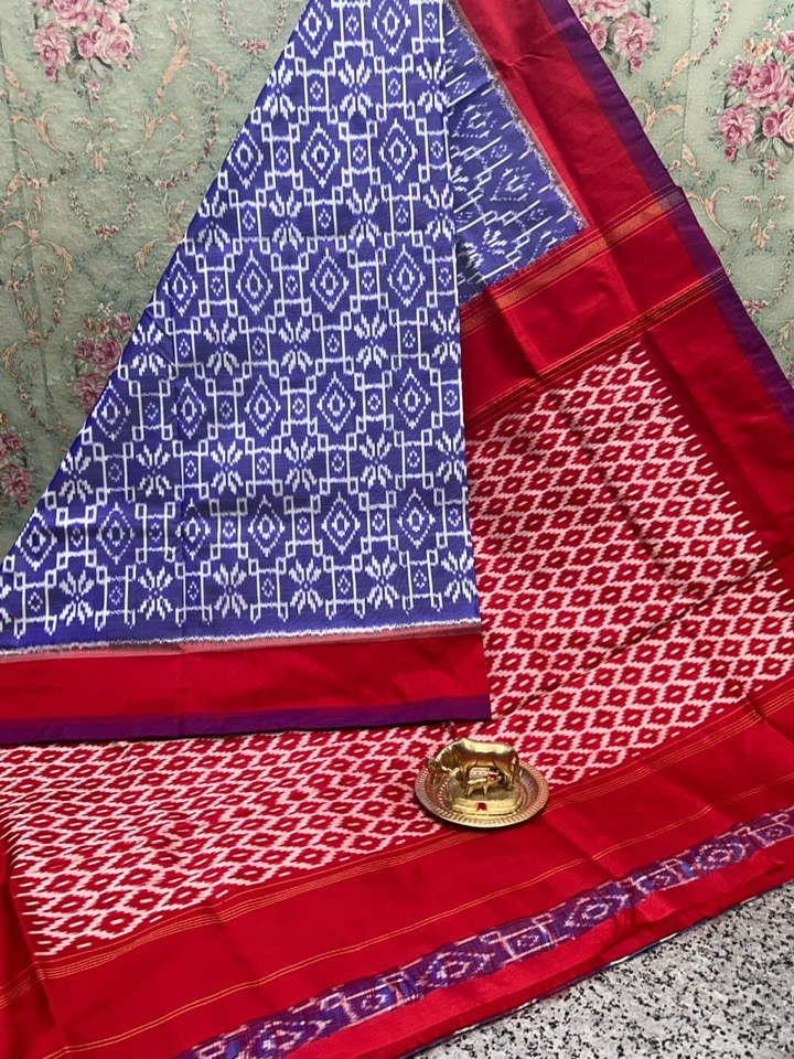 Light Lavender Blue and Red Pure Ikkat Double Weaving Silk Saree