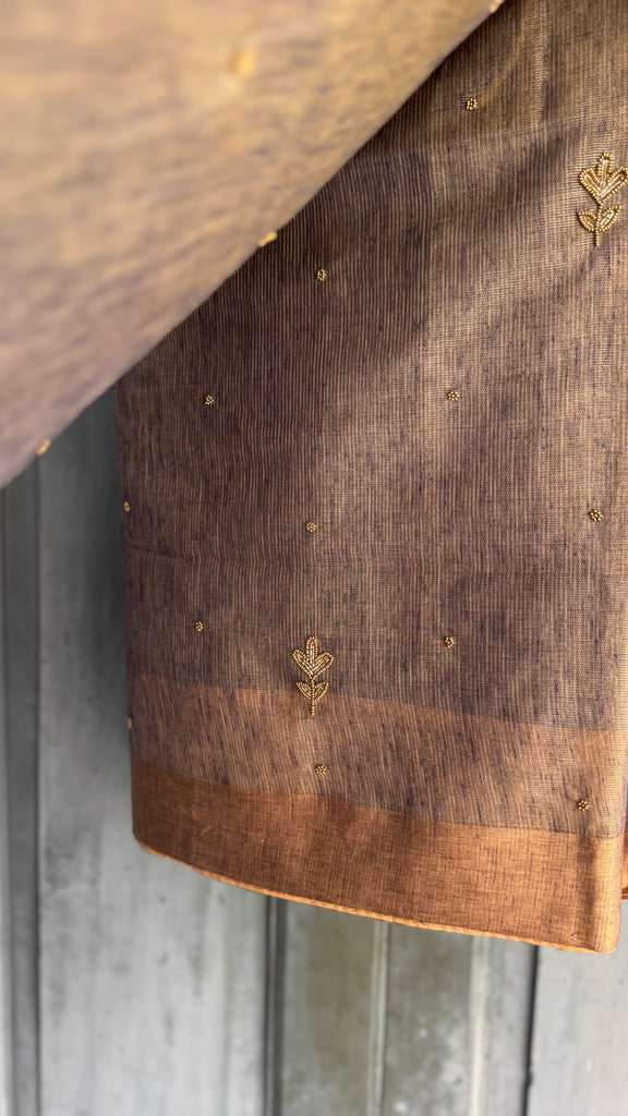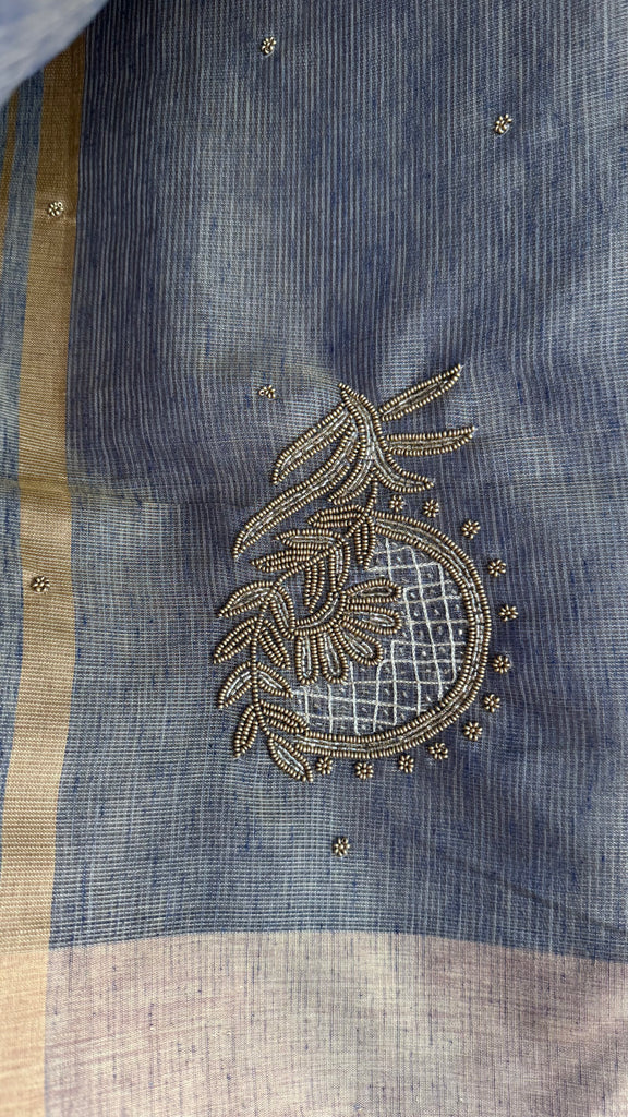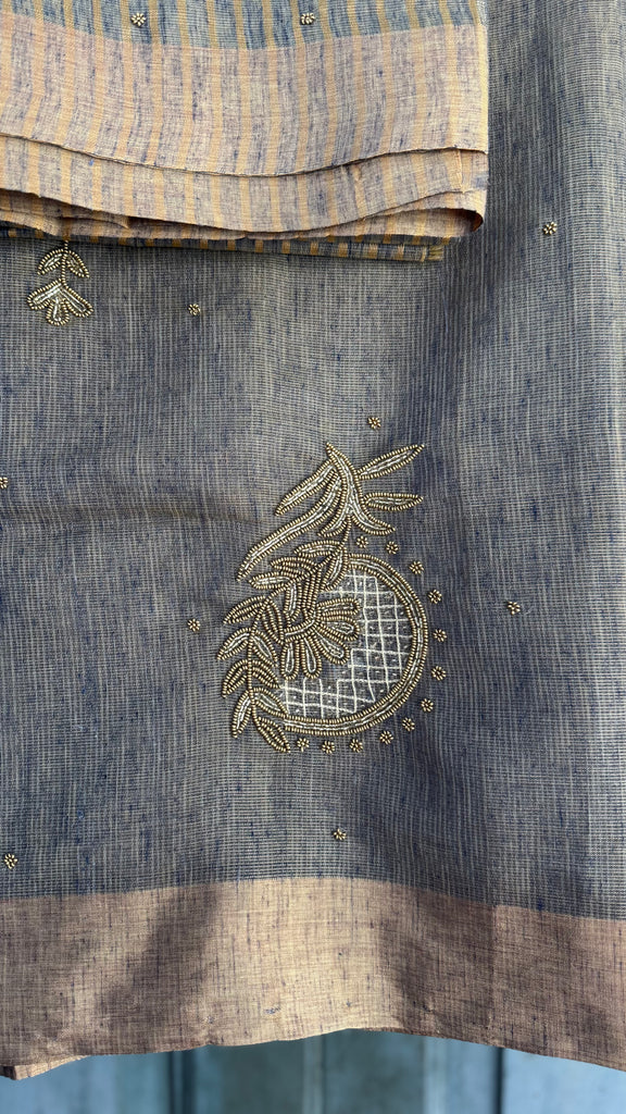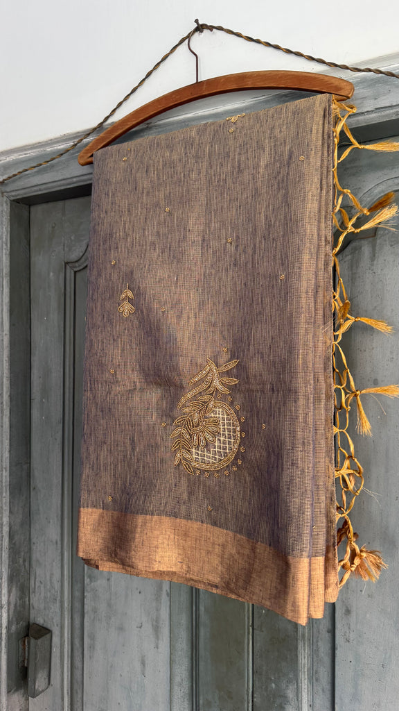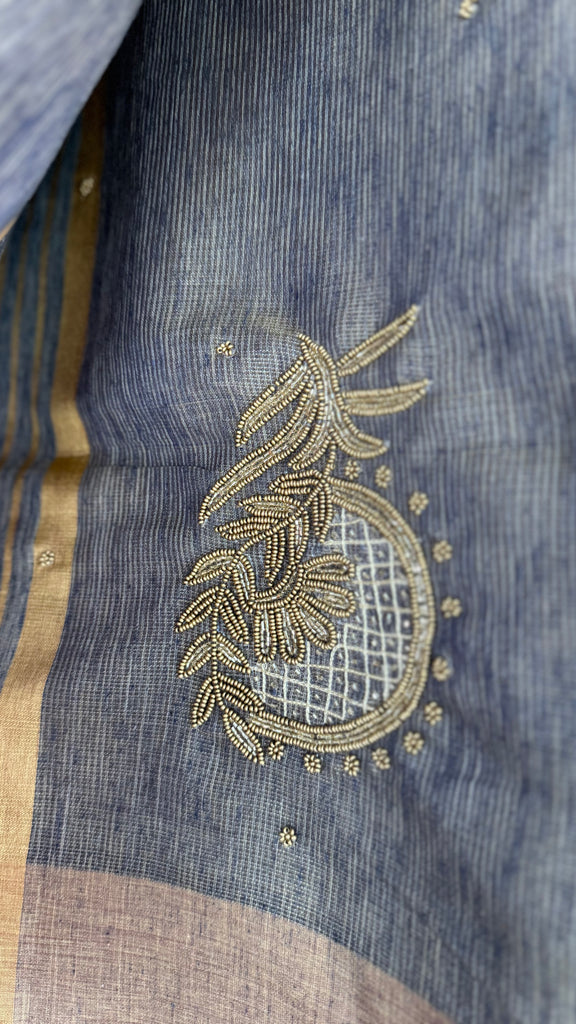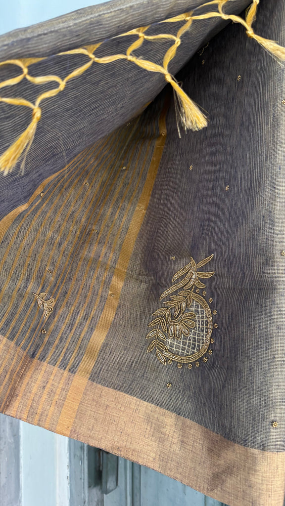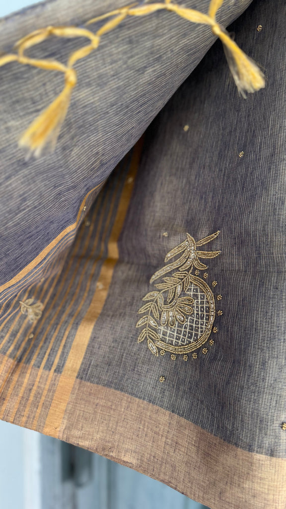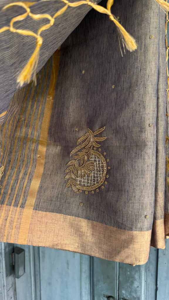 Dual Tone Grey Silver Gold Tone Tissue Linen Saree