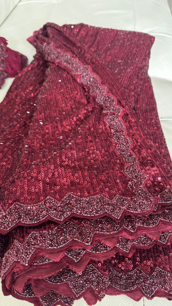 Elevate your traditional wardrobe with this Maroon Sequin Saree featuring a delicate lace sequin border. The rich maroon fabric is adorned with shimmering sequins that catch the light gracefully, while the intricate lace border adds refined elegance. Perfect for festive occasions and formal events, this saree blends classic charm with contemporary sparkle, ensuring a sophisticated and striking look.