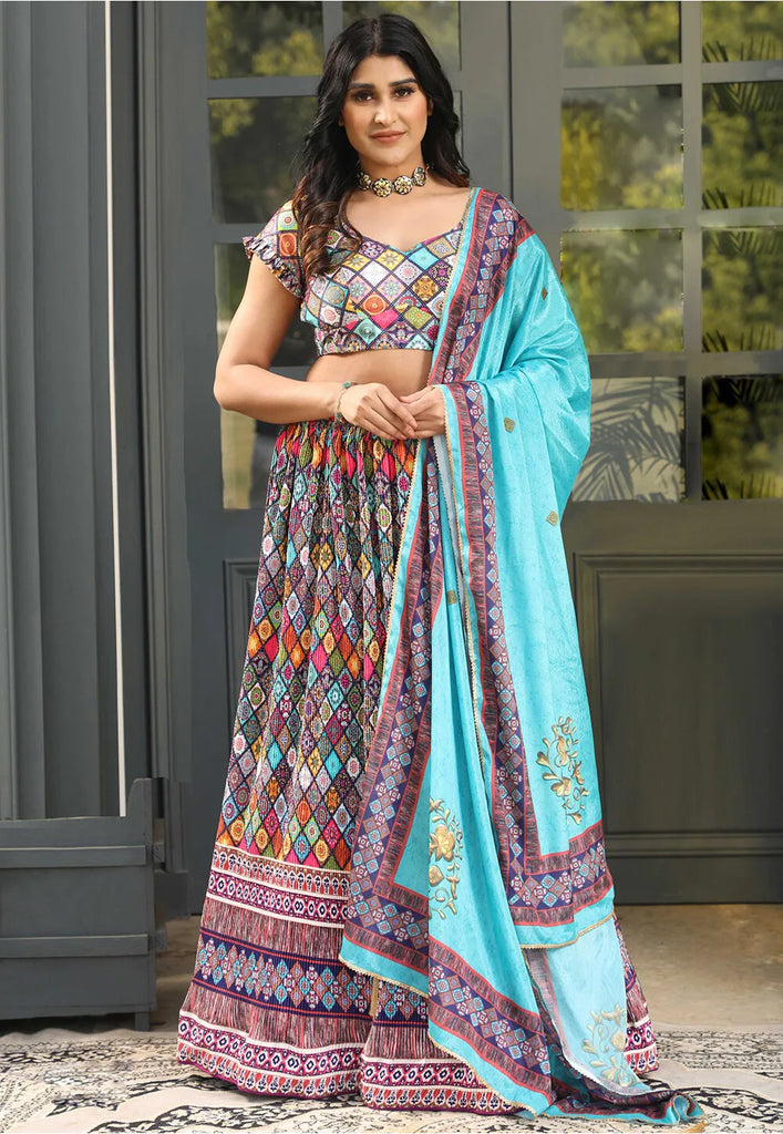 - Available with an 36 stitched Satin Choli in Multicolor and a Chinon Chiffon Dupatta in Sky Blue