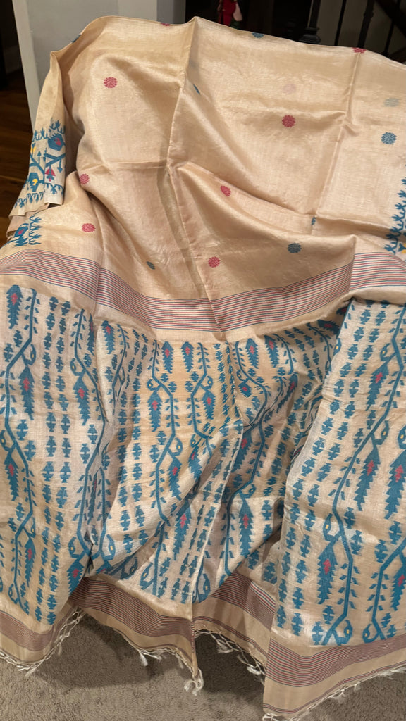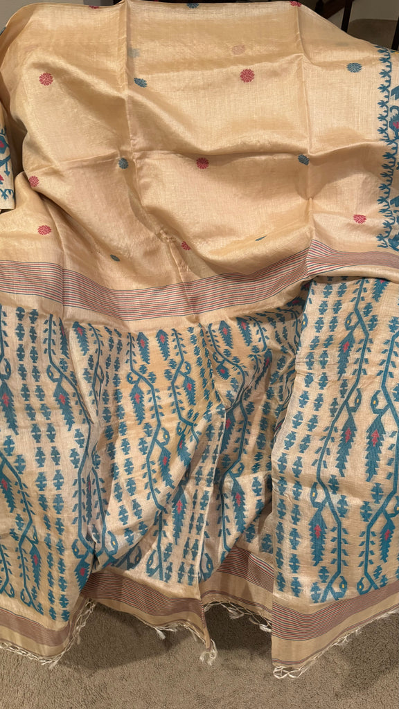 Teal Handwoven Pure Tussar Silk Jamdani Saree