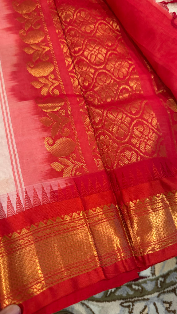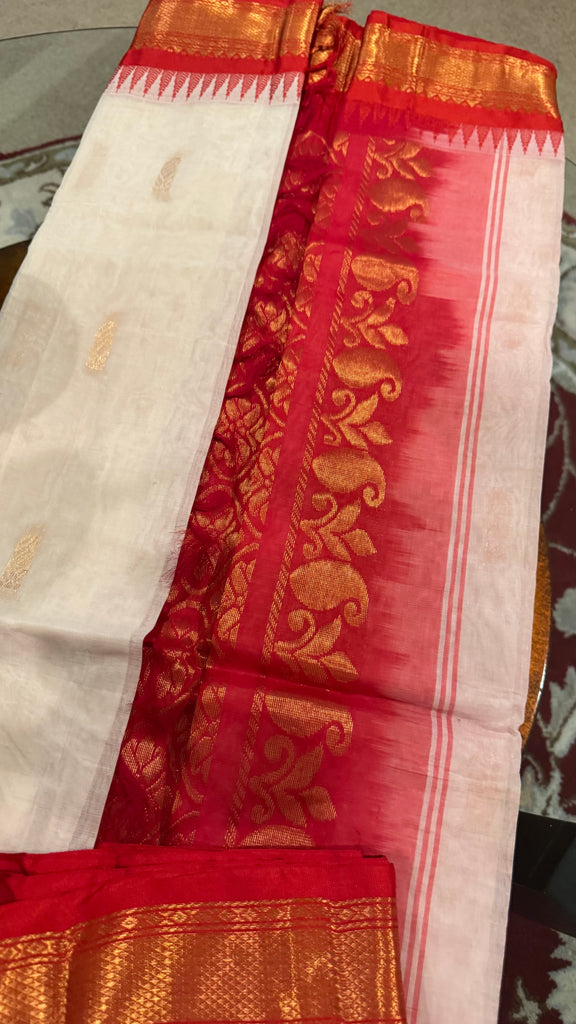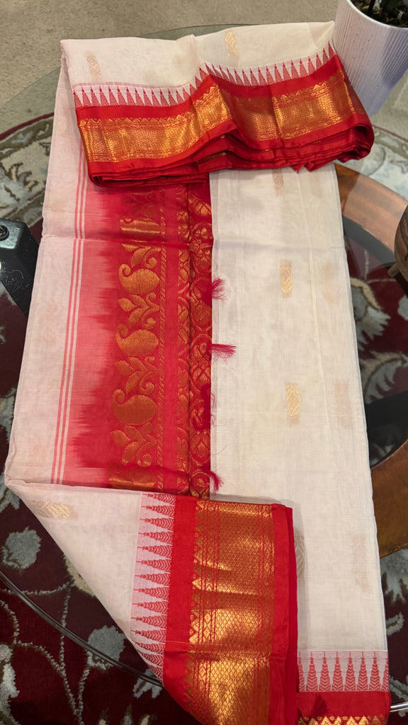 White and Red Cotton Gadwal Saree