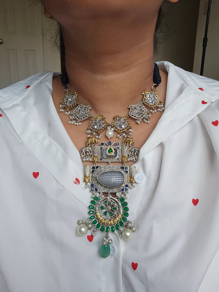 Elevate your accessory game with our exquisite dual-tone choker necklace. Crafted from premium brass, this necklace features intricate detailing that beautifully captures a fusion of traditional and contemporary styles. The silver-like finish adds a touch of elegance, making it a versatile piece perfect for any occasion.