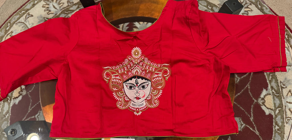 Make yourself comfortable and beautiful in this Red Cotton Elbow Sleeve Durga Embroidered Blouse on Back. Front Hook Non Padded. A blouse is considered as one of the most sensuous of all garments created for women. This blouse Ideal for pure Bengali Ethnic look.
