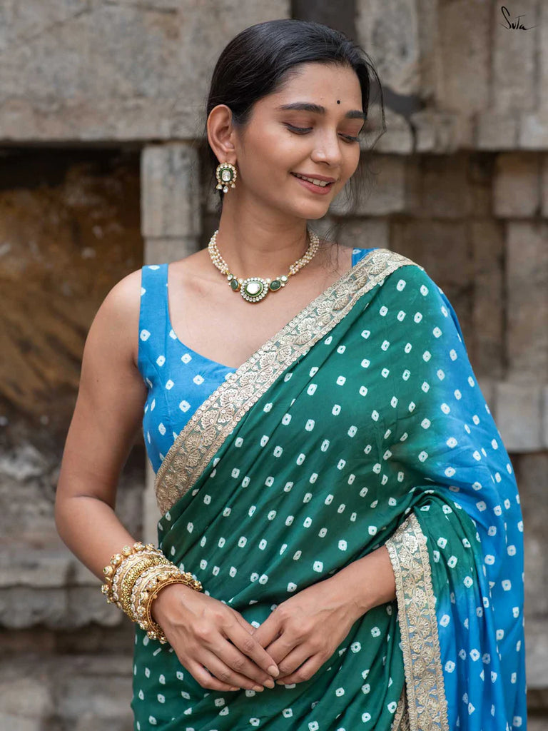 Blue & Green Ombré Bandhani Cotton Muslin Saree with Gold Lace & Tassels