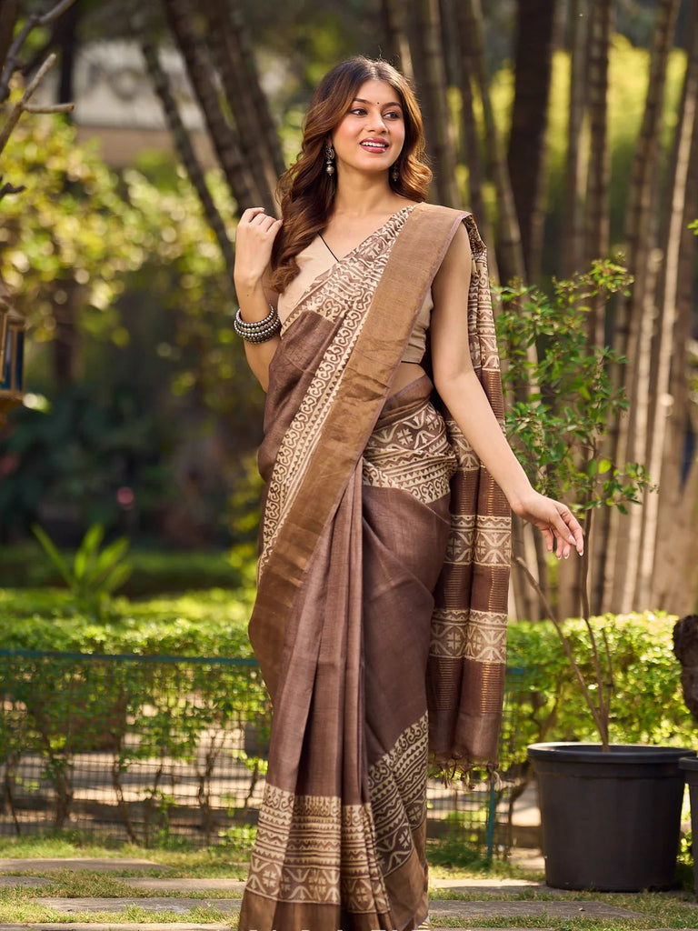 Stand out in the crowd in this gorgeous Elegant Earthy Pure Tussar Silk Block Print Saree featuring Heritage Prints and Natural Tones. This is a beautiful Brown Batik Silk Saree.