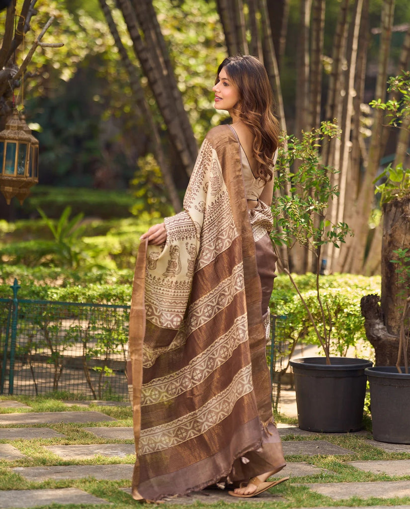 Earthy Pure Tussar Silk Block Print Saree featuring Heritage Prints and Natural Tones