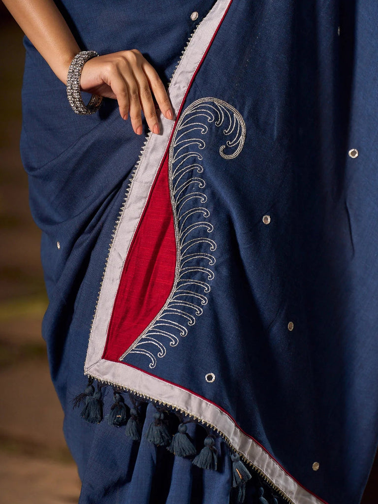 Embrace understated sophistication with this striking grey saree, where tradition meets bold artistry. Each thread of the hand-embroidered pallu tells a story of meticulous craftsmanship, creating an audacious statement piece that refuses to fade. Perfect for those daring enough to let elegance speak louder than trends.