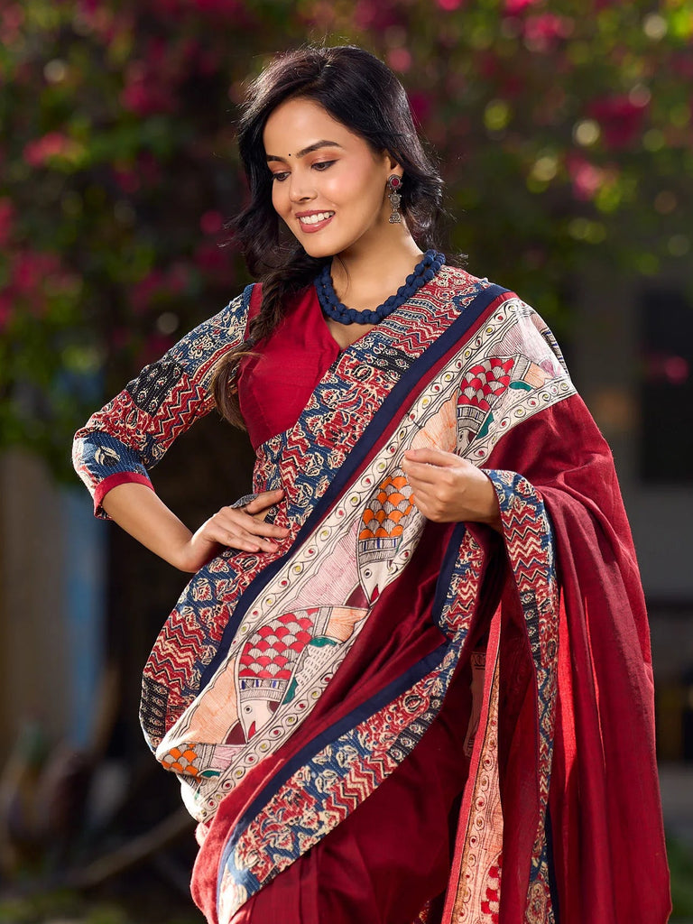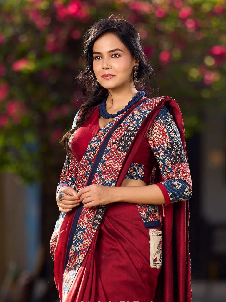Maroon Cotton Saree with Vibrant Ajrakh Kantha Patchwork & Madhubani Border