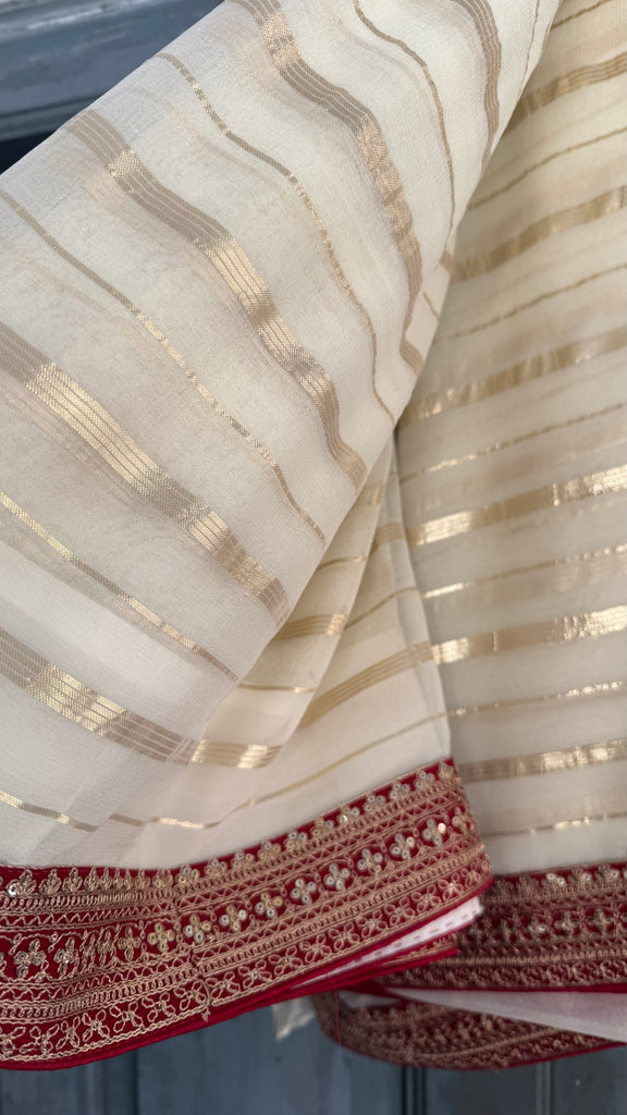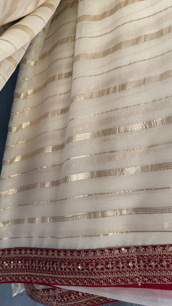 Shimmer, shine, and slay in this stunning White and Red Georgette Chiffon Zardosi Saree paired with unstitched contrast Red blouse! ✨ Perfect for festive elegance and timeless charm. 💫