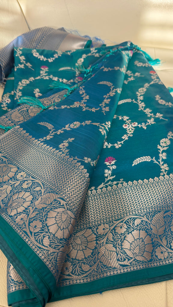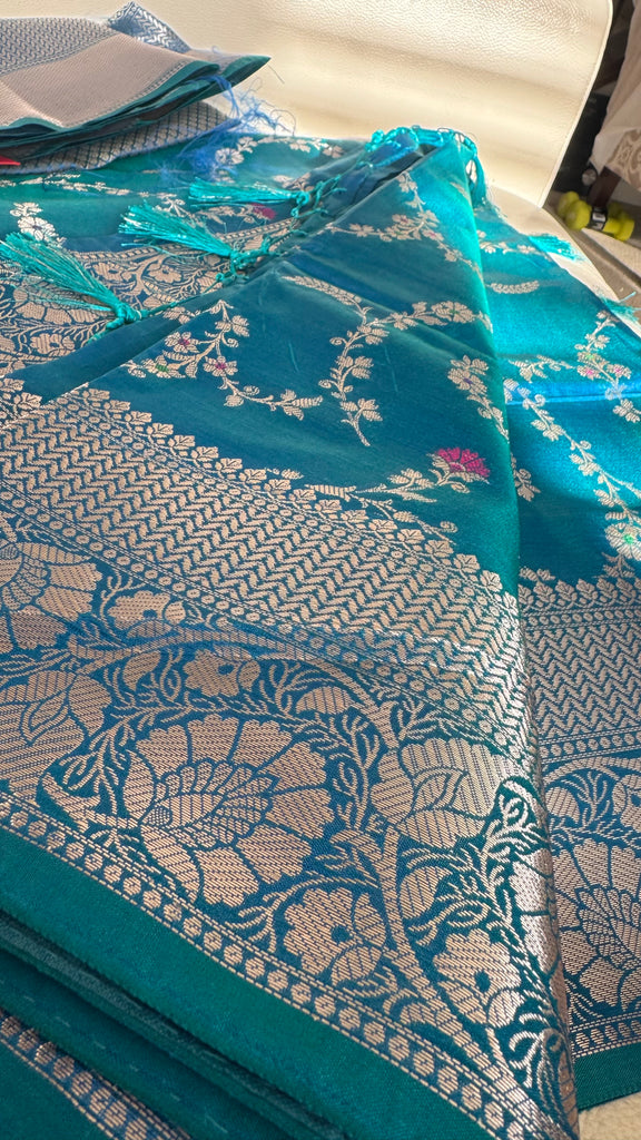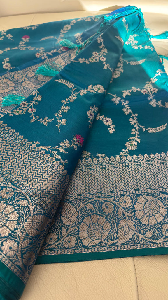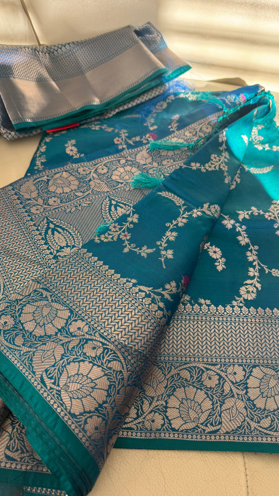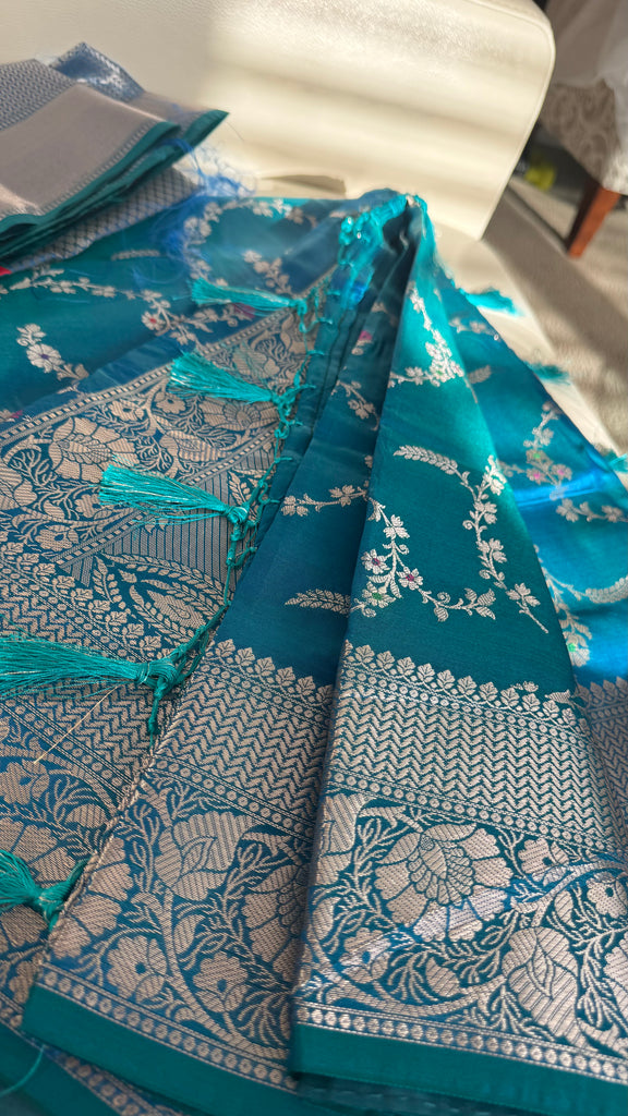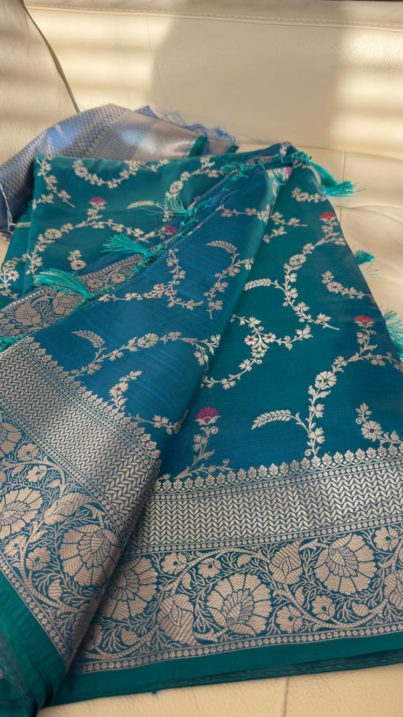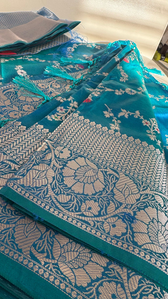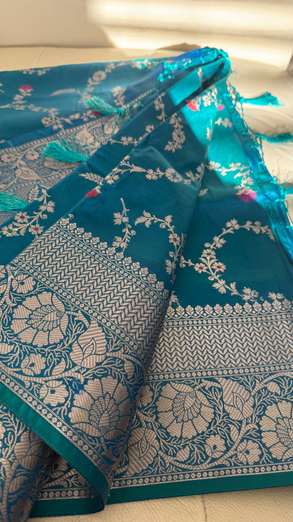 PEACOCK BLUE FLORAL SILK SAREE with SILVER ZARI BORDER