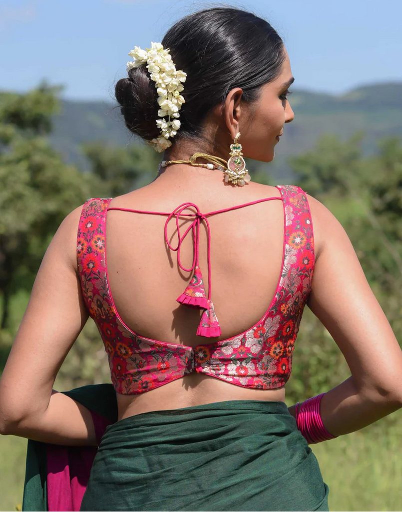 Delicate, vibrant, and festive, the Pink Goldis crafted to add elegance to any saree. Made from rich brocade fabric, this sleeveless blouse features a classic dome neckline, intricate floral embroidery, and a back-open hook closure for a flattering fit. Perfect for weddings, festive celebrations, or special occasions, it brings a touch of charm and traditional glamour to your ensemble.