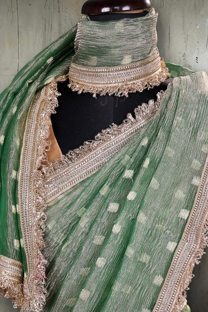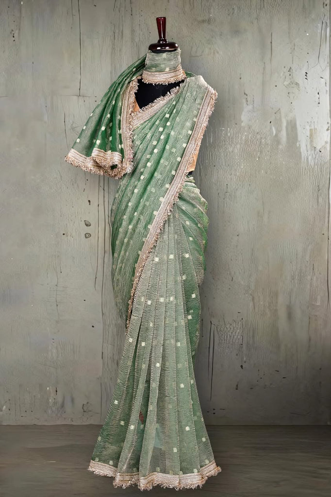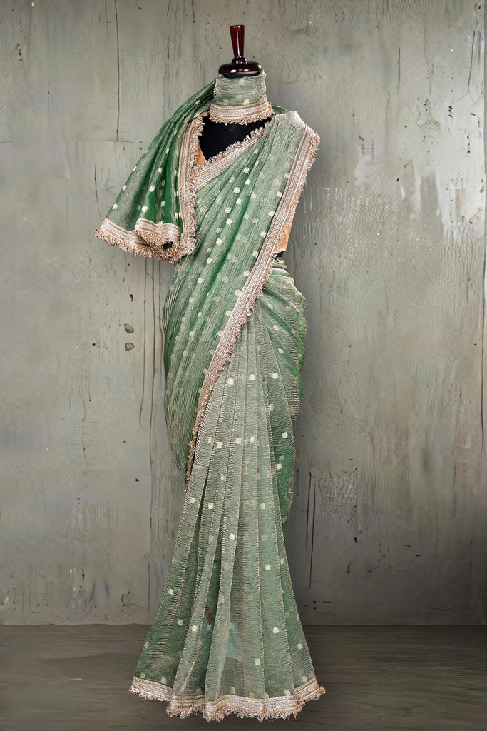 A Tissue Banarasi saree is a luxurious and elegant variation of the traditional Banarasi saree, made from a delicate, lightweight fabric called tissue. These sarees are woven in Varanasi (Banaras), the ancient city of India famous for its fine silk weaving techniques. The term "tissue" refers to the use of thin, metallic threads (often made of gold or silver) interwoven with silk to create a shiny, almost transparent effect.