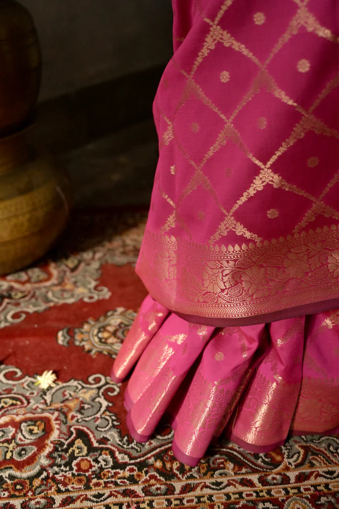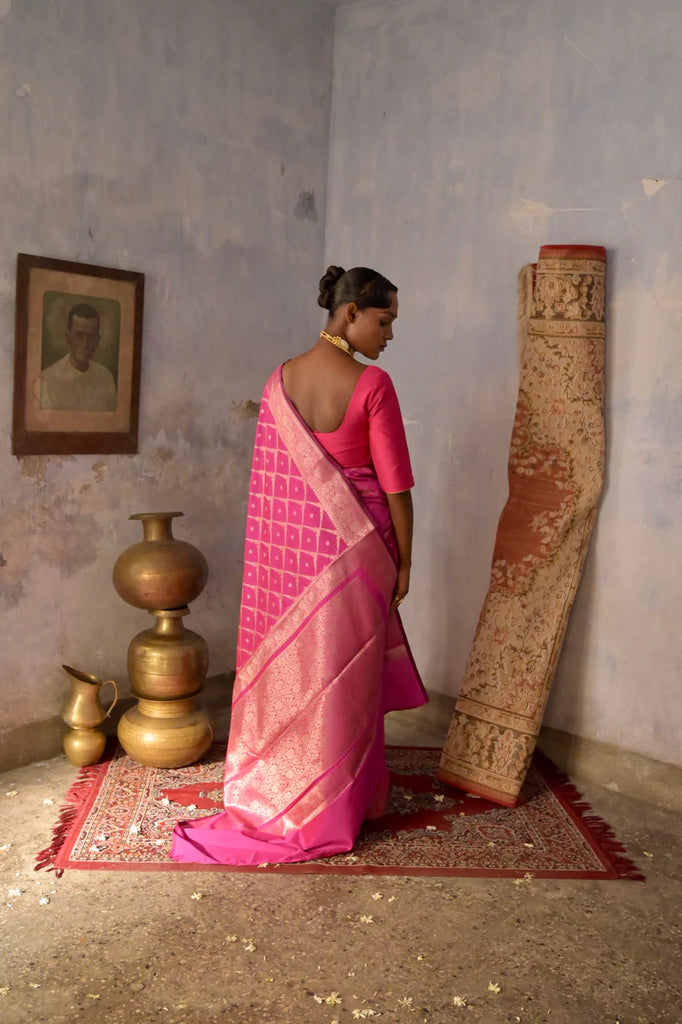 Rani pink Handloom silk Jaal Banarasi Saree with floral Zari Border