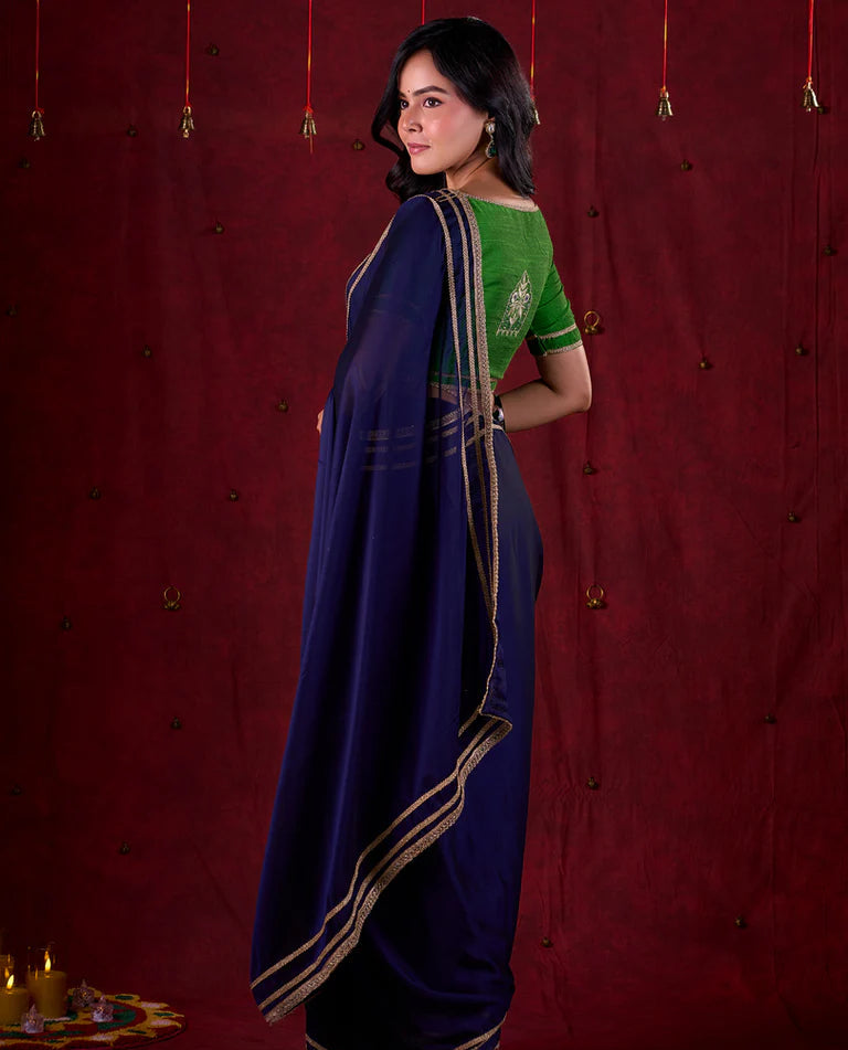 Royal Navy Silk Blend Ready To Wear Saree Adorned with Subtle Golden Lace