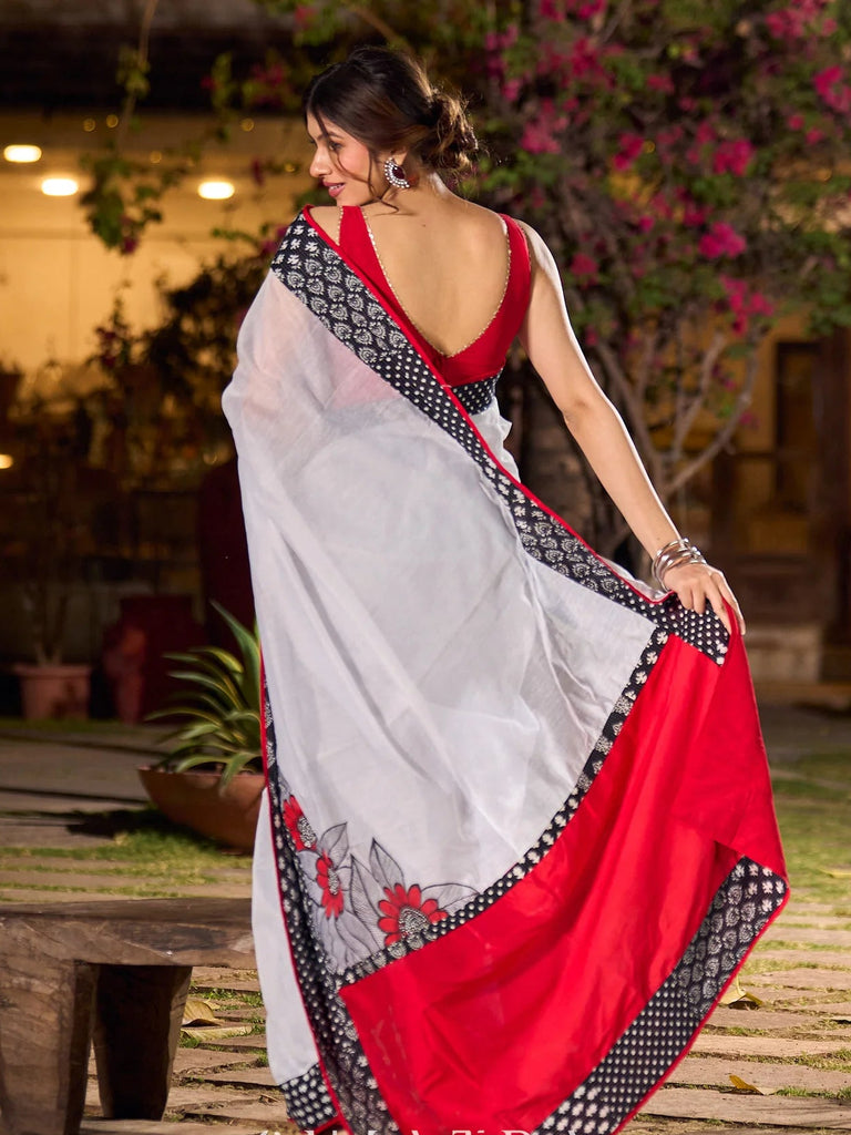 White Chanderi Saree with Kantha Patchwork Border & Delicate Hand Painting