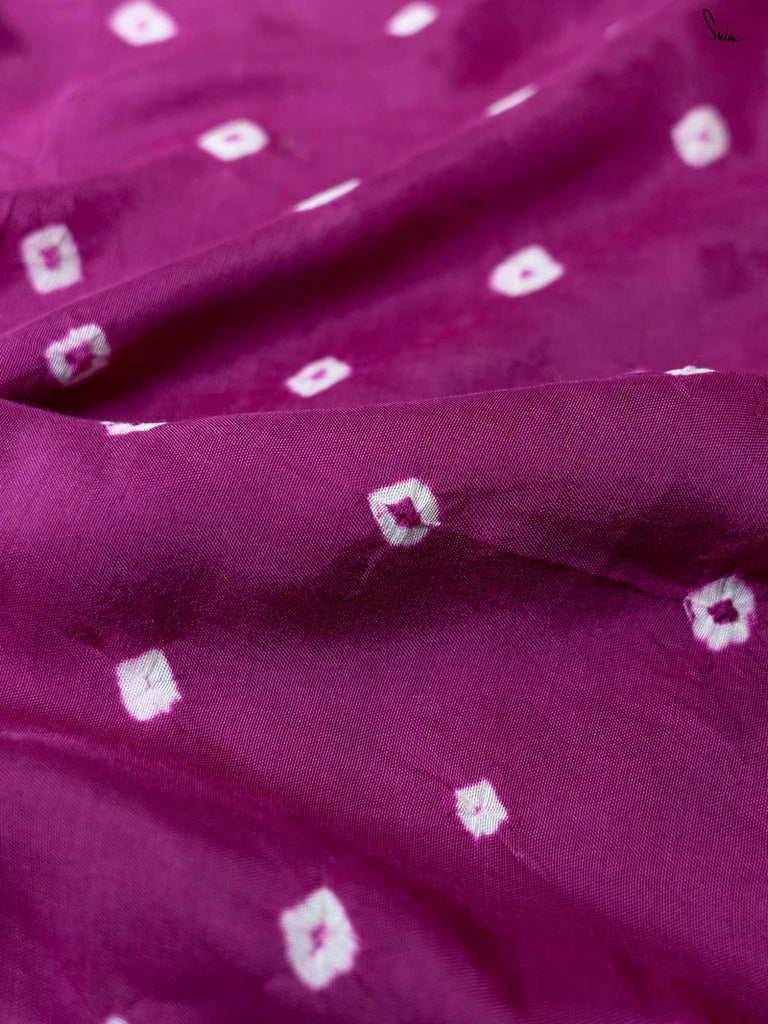 Jamuni sa Bandhej is a joyful interplay of light and depth in the Rangrez collection, where vibrant yellow blends effortlessly into regal purple in a fluid ombré drape. Woven in soft, breathable cotton muslin, the saree is adorned with the traditional tie-and-dye Bandhani technique of Gujarat, where each knot transforms into delicate dotted motifs that carry the soul of heritage. The radiant colours are accentuated with shimmering gold lace and handcrafted beaded tassels, creating a festive sparkle that dances with every movement. Playful yet elegant, Jamuni sa Bandhej is made for celebrations that call for colour, tradition, and charm.
