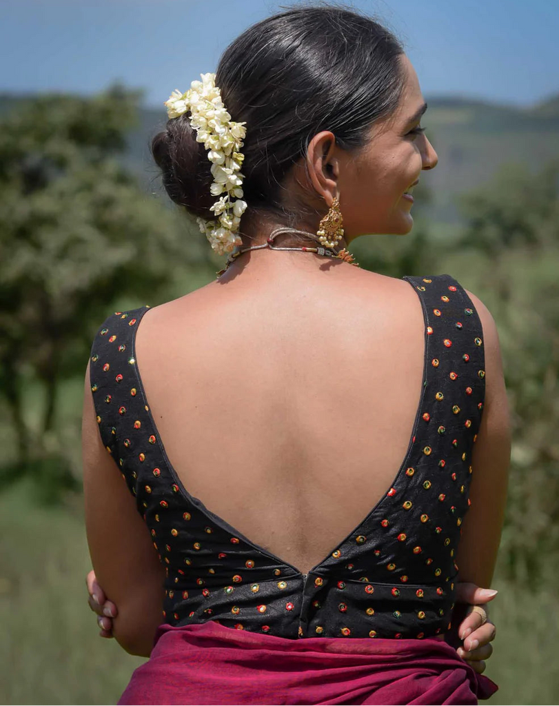 Chic, elegant, and effortlessly festive, the Carbon Gold is a striking addition to your saree wardrobe. Crafted with intricate machine embroidery in playful polka motifs, this sleeveless blouse features a sophisticated dome neckline and a back-open hook closure for a comfortable, flattering fit. Perfect for pairing with festive, wedding, or evening sarees, it brings a touch of glamour and modern charm to any celebration.