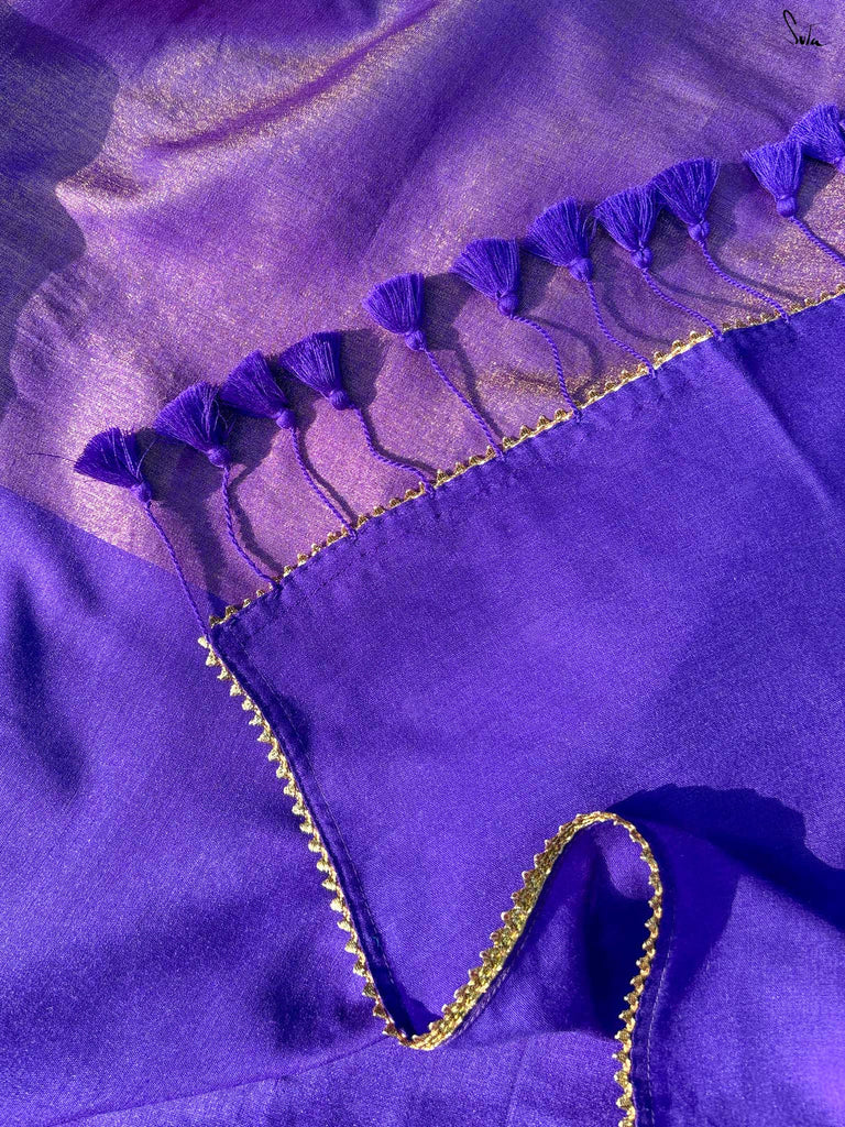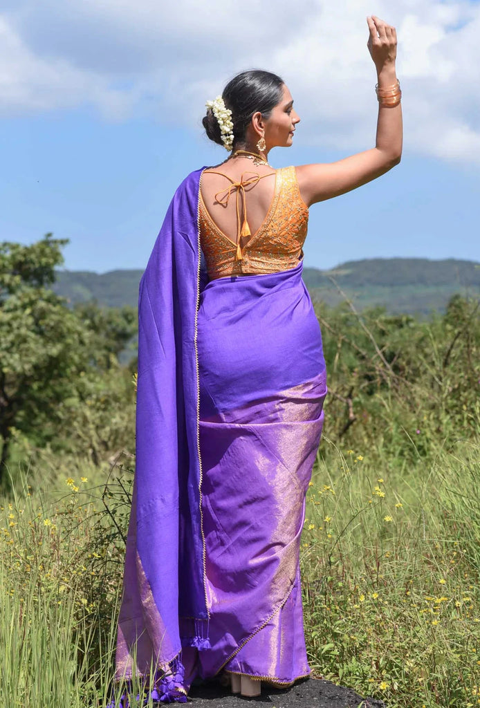 Grace blooms in every fold of Dipped in Orchids. This cotton-acrylic saree is woven in a luminous half-and-half blend of deep blue and gold zari, finished with elegant gold scallop lace that adds a soft, festive radiance. Thoughtfully crafted, it drapes beautifully, perfect for weddings, festive occasions, or any moment that calls for understated opulence.